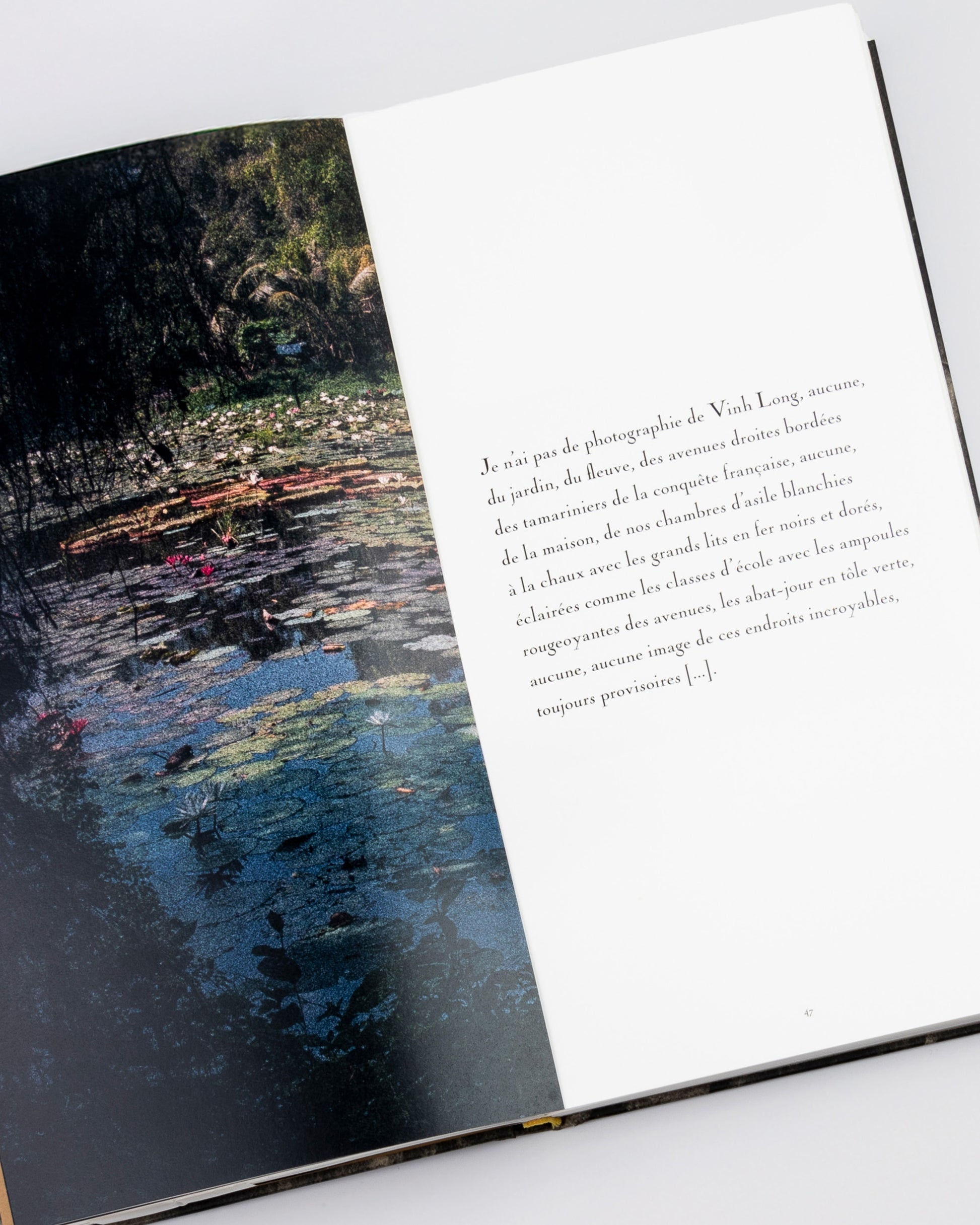 De courts extraits de textes de Marguerite Duras forment un contrepoint aux photographies en noir et blanc virés au thé. Par ces procédés techniques, l’artiste façonne tout autant qu’elle restitue le monde déployé sous ses yeux pour en extraire des images qui se confrontent à la fragilité des souvenirs et à la capacité de la photographie de créer de la vérité plus vraie qu’une réalité.